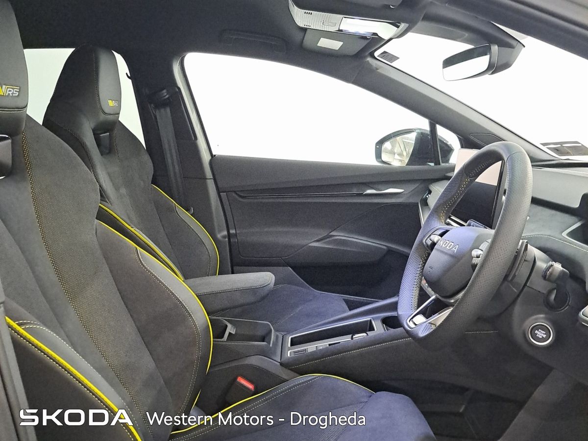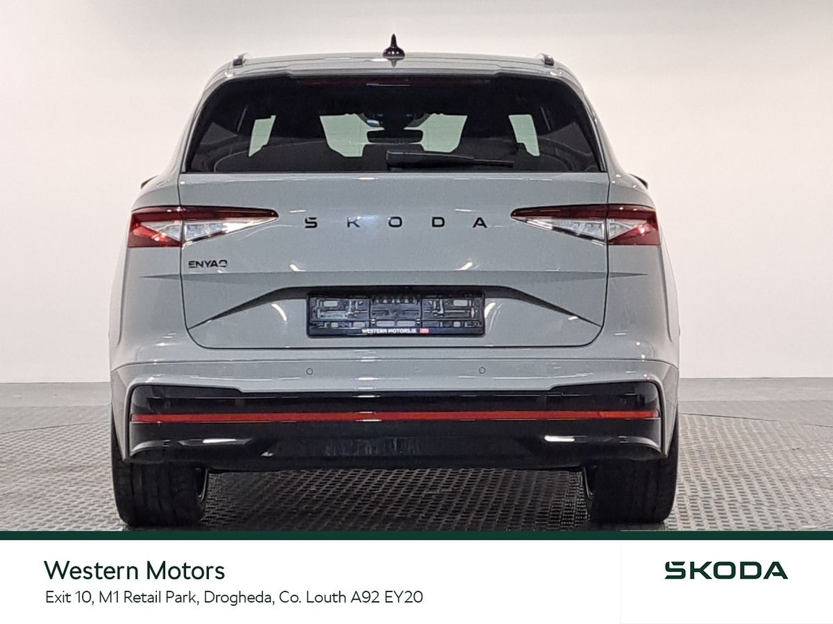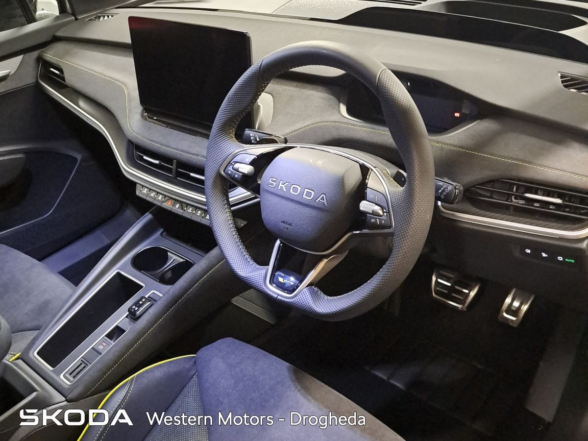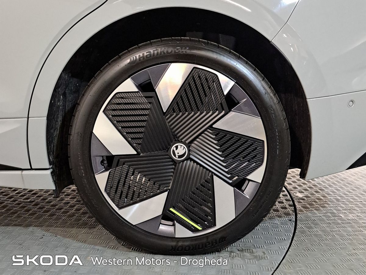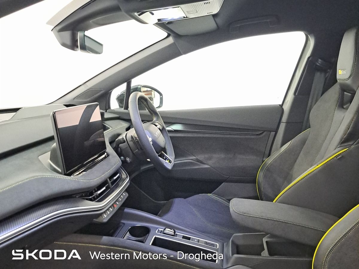Offering an all new sleek design and Modern Solid finish the Enyaq offers a high quality finish and includes front & rear parking sensors with rear view camera, Adaptive Cruise Control,13" touchscreen radio with bluetooth, android auto & apple car play, heated front seats, Electric Tailgate, electric drivers seat with massage funcitonality, 21" Vision Alloys, plus the exclusive RS interior finish from sports seats, aluminium sports pedals, plus much more