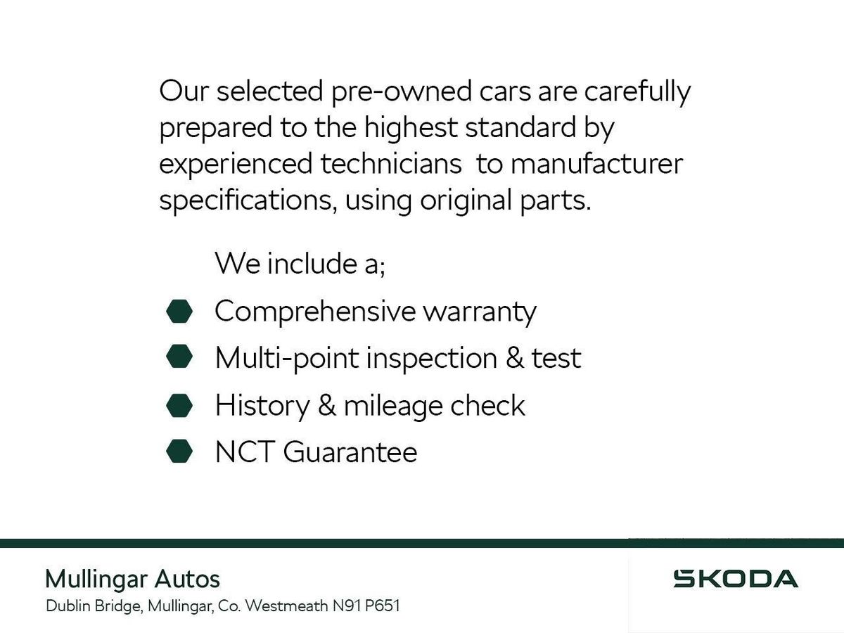 Trade ins welcome - Finance available. At Mullingar Autos, our Used Cars come with: Full vehicle history check. Comprehensive Warranty. Maintenance up to date. Competitive finance available. Outstanding Aftersales care. Want finance info, to view a video of this vehicle or reserve it now – Simply visit www.mullingarautos.ie. Alternatively, call us now on 044 934 8755 or visit us on the Dublin Bridge, Mullingar, Co. Westmeath, N91 P651.