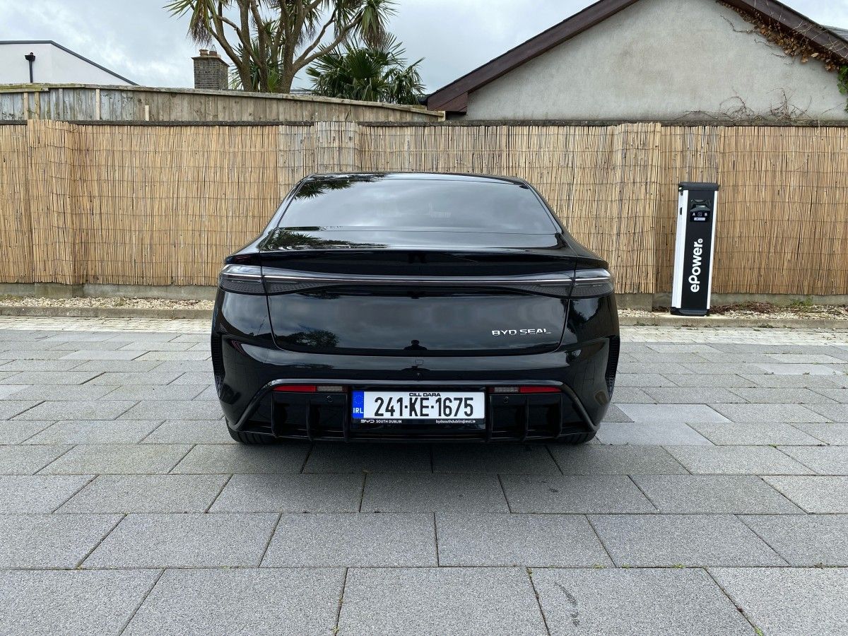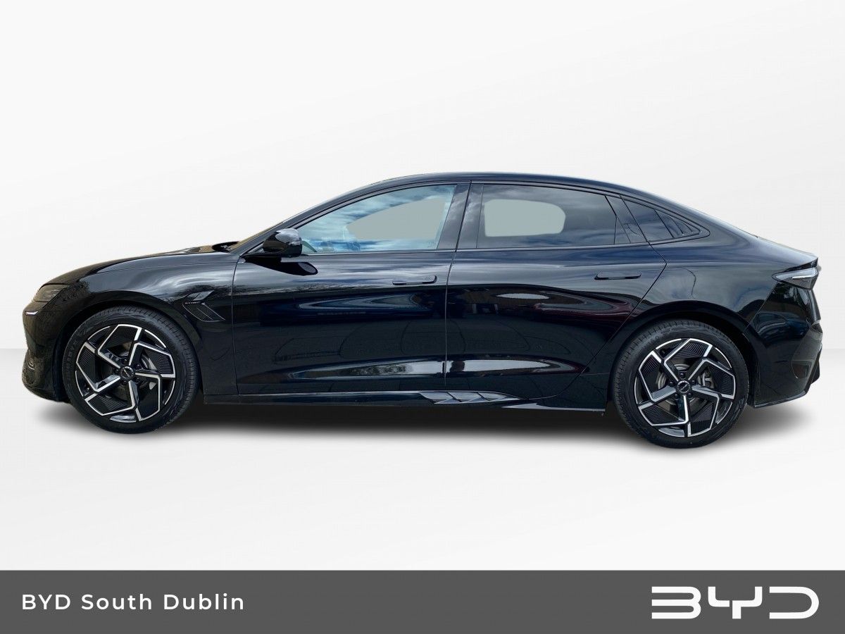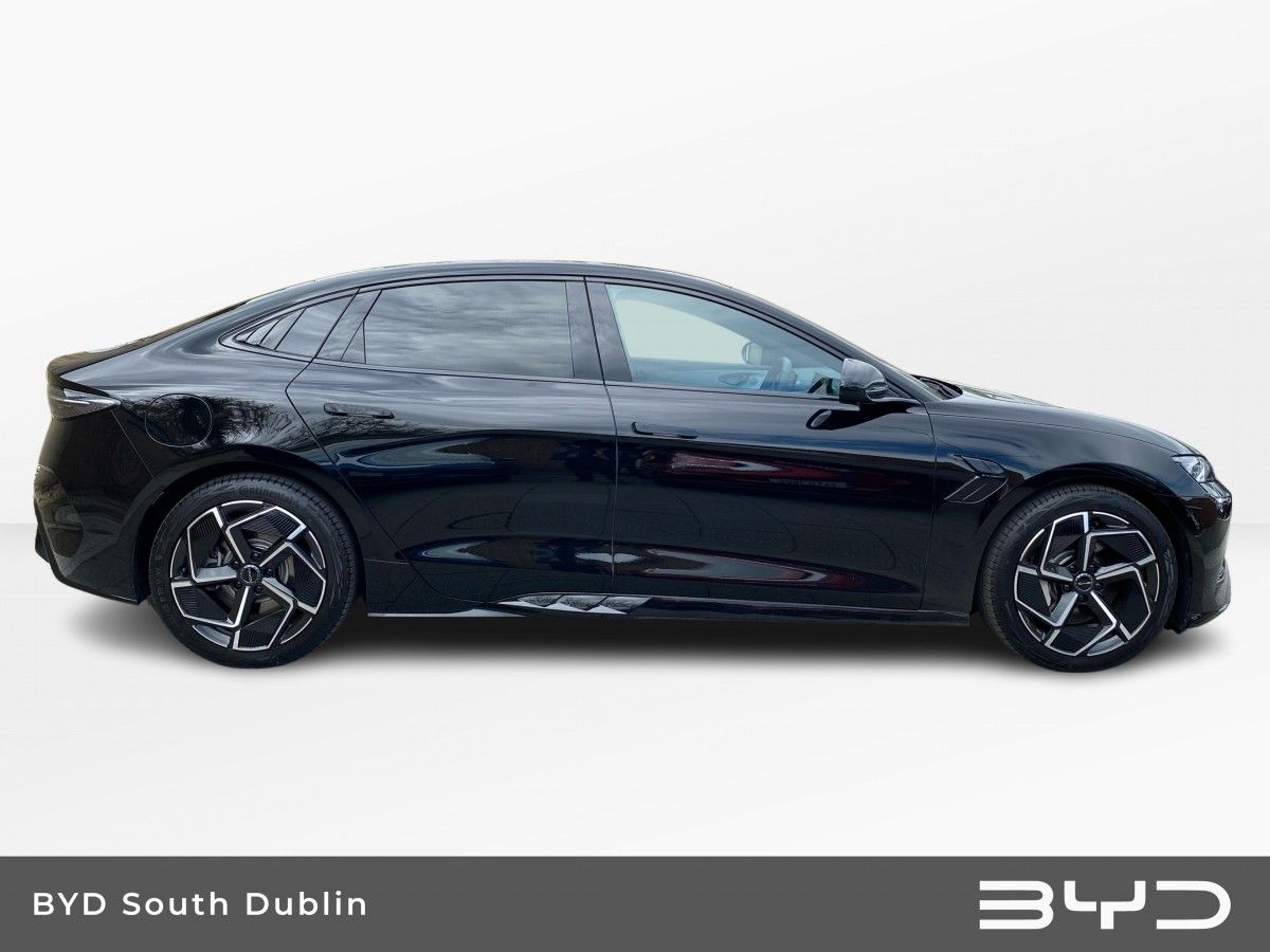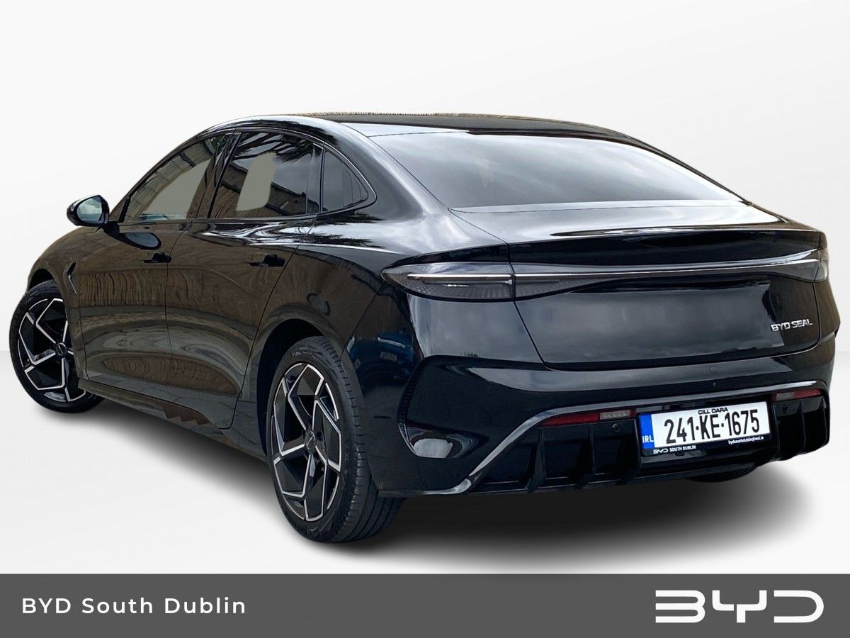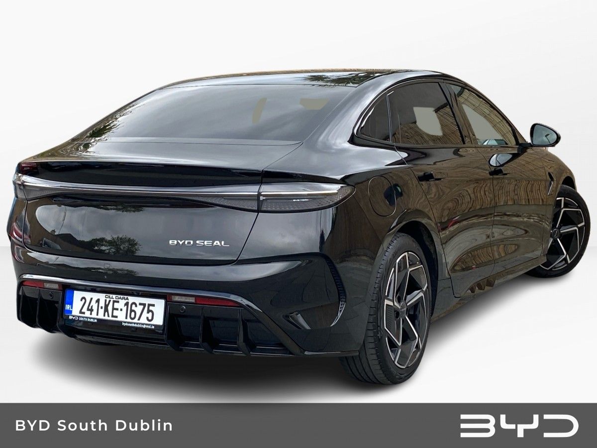 This BYD Seal is presented in Space Black. This highly equipped DESIGN model is fitted with BYD’s latest technology including the 15.6” Electric Rotary Touchscreen & Rhythm-reactive multi-colour ambient lighting.