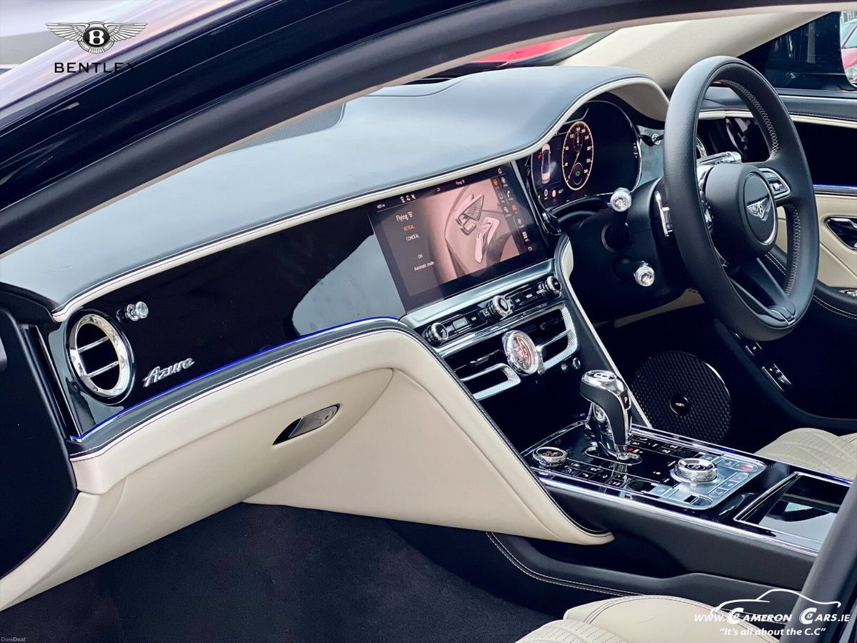 Introducing an exceptionally specd 2023 Bentley Flying Spur Azure V6 Hybrid, finished in timeless Black with a luxurious Linen Main Hide and Damson Secondary Hide. This Flying Spur represents the perfect blend of efficiency, performance, and handcrafted elegance.