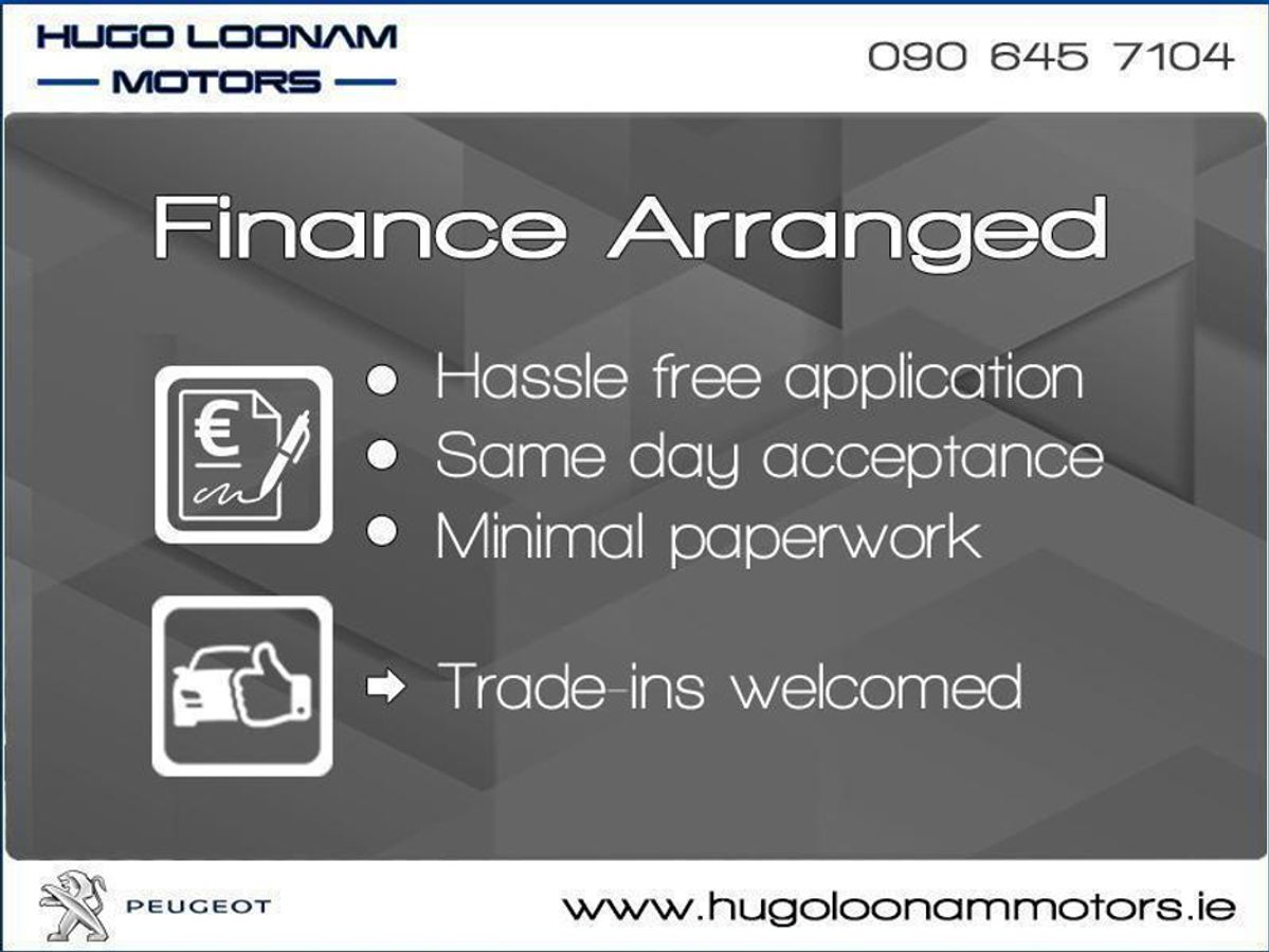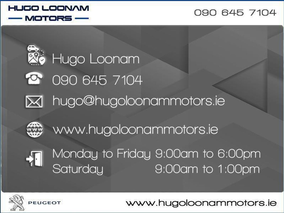 Contact Kevin or Sean at Hugo Loonam Motors for more information. Central Locking, Electric Windows, Airbag, Cruise Control, Fog Lamps, Rear Spoiler, Privacy Glass, Centre Armrest, Multi-function steering wheel, Roof Rails, Satellite Navigation, Traction Control, Metallic Paint, Anti-Theft System, Parking Sensors, Bluetooth, Isofix, Apple Car Play, Android Auto, Active Safety Braking / City Brake / Collision Alert, Stop/Start Button, Touch Screen Media Control, External Devices Connectivity, Cup holders, Stability control
