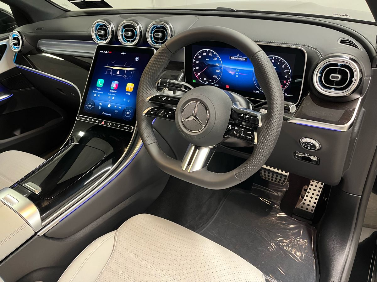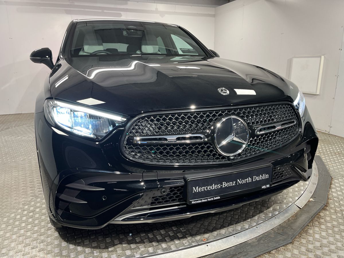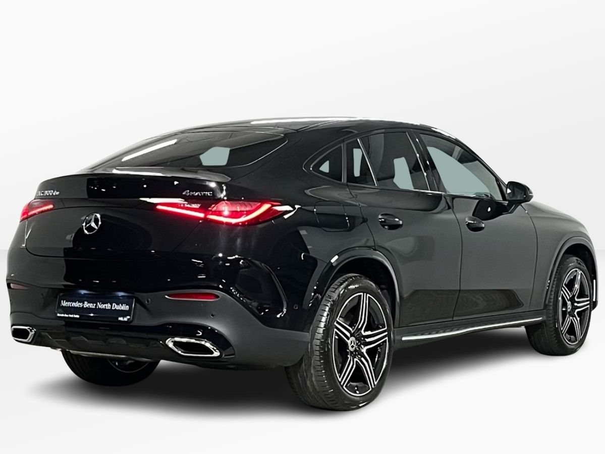 Finished in classic Black with a refined grey Artico leather interior, this Mercedes-Benz GLC300de 4MATIC Coupé combines the sporty character of AMG styling with the modern efficiency of a plug-in diesel hybrid. The vehicle features desirable enhancements such as the AMG Line exterior and interior packages, 20" AMG alloy wheels, Night Package, and running boards in aluminum look. Inside, drivers enjoy heated memory seats, a Supersport leather steering wheel, premium ambiance lighting, and wireless phone charging. This model is loaded with technology, including the MBUX Premium infotainment system with navigation, smartphone integration, DAB radio, and a large central display. Safety is prioritised through Active Parking Assist, Blind Spot Monitoring, Lane Keeping Assist, and a rearview camera. With all-wheel drive, 9-speed automatic transmission, and adaptive comfort suspension, this GLC Coupé delivers confident performance across every journey. A true blend of performance, luxury, and practicality, this model is ideal for those seeking a high-spec, low-emission SUV coupé.