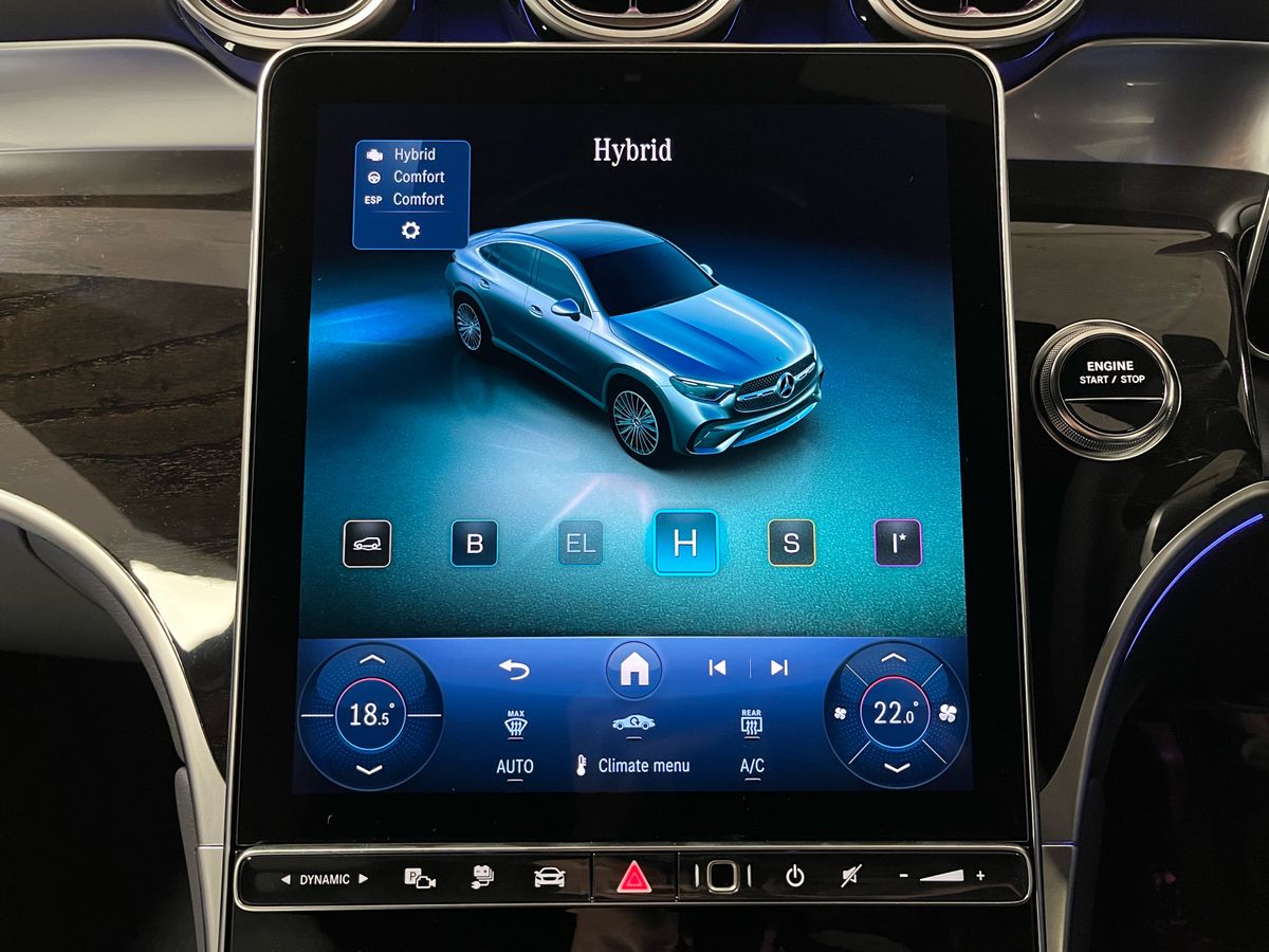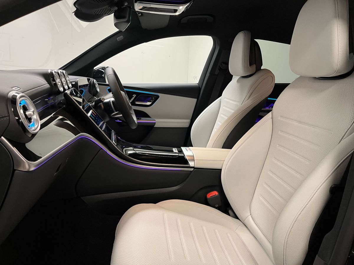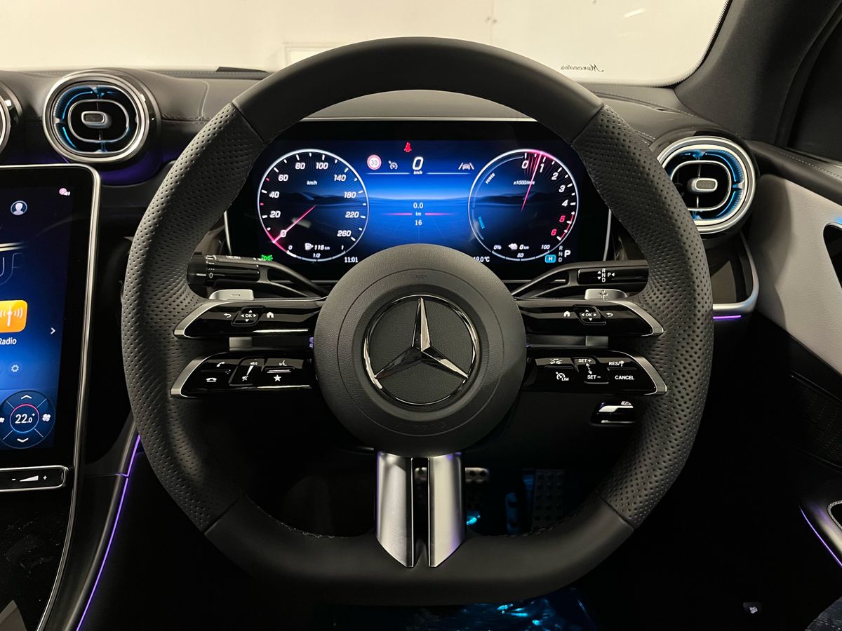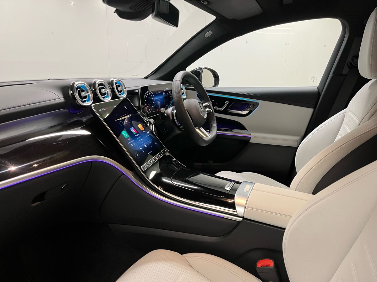 Finished in classic Black with a refined grey Artico leather interior, this Mercedes-Benz GLC300de 4MATIC Coupé combines the sporty character of AMG styling with the modern efficiency of a plug-in diesel hybrid. The vehicle features desirable enhancements such as the AMG Line exterior and interior packages, 20" AMG alloy wheels, Night Package, and running boards in aluminum look. Inside, drivers enjoy heated memory seats, a Supersport leather steering wheel, premium ambiance lighting, and wireless phone charging. This model is loaded with technology, including the MBUX Premium infotainment system with navigation, smartphone integration, DAB radio, and a large central display. Safety is prioritised through Active Parking Assist, Blind Spot Monitoring, Lane Keeping Assist, and a rearview camera. With all-wheel drive, 9-speed automatic transmission, and adaptive comfort suspension, this GLC Coupé delivers confident performance across every journey. A true blend of performance, luxury, and practicality, this model is ideal for those seeking a high-spec, low-emission SUV coupé.