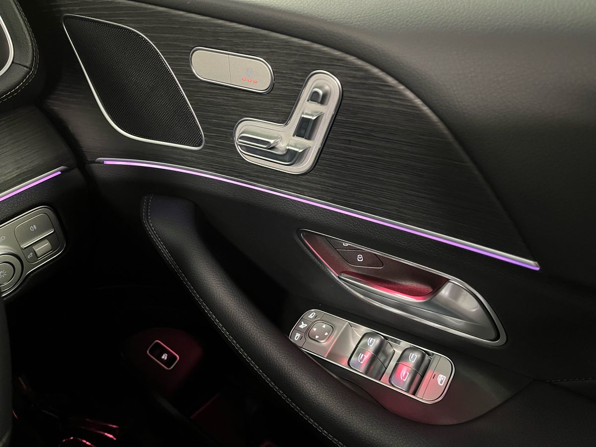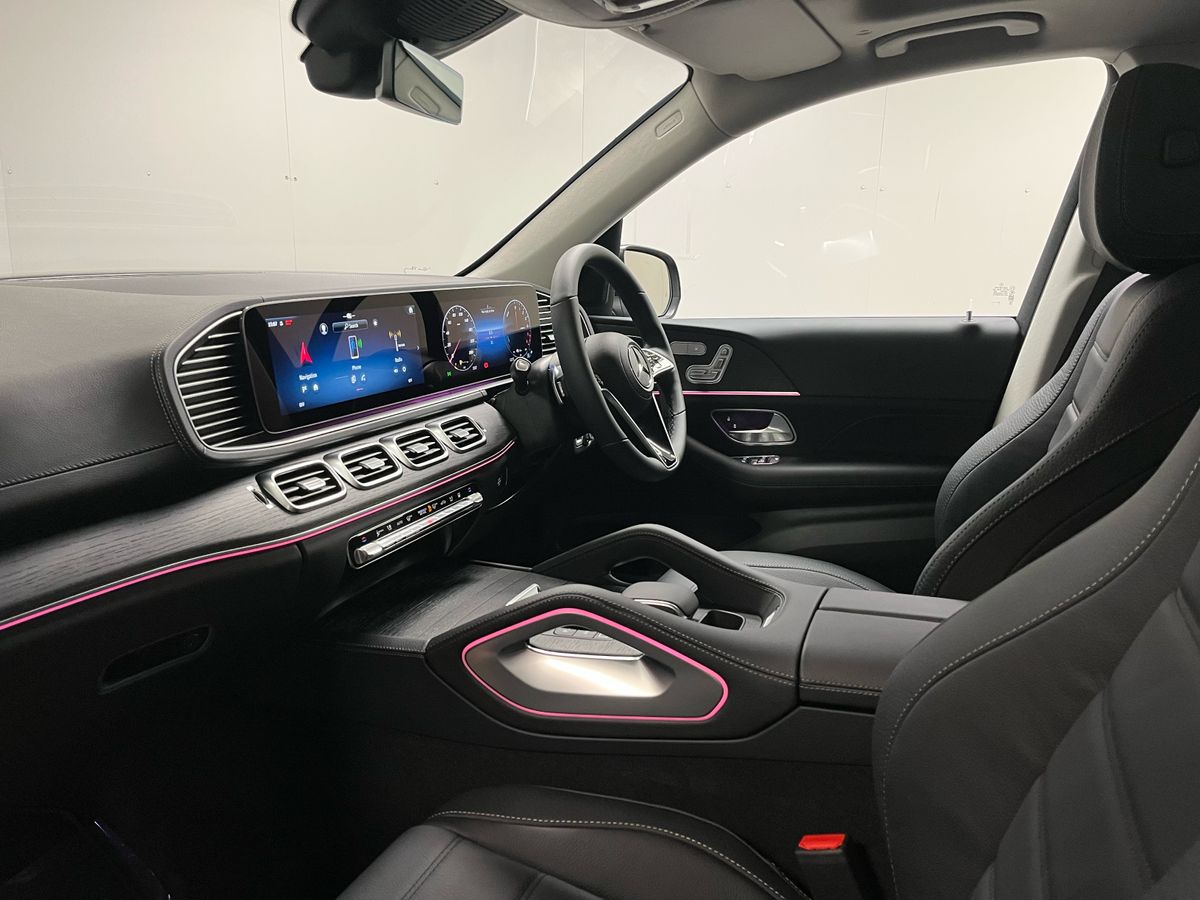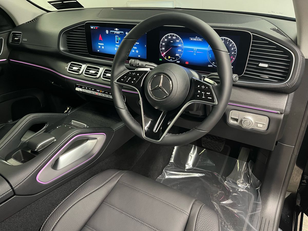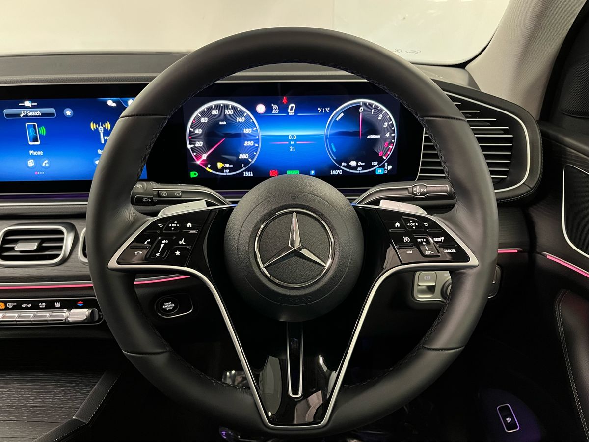 The Mercedes-Benz GLE 350 de 4MATIC is presented in classic Black with a refined Black/Anthracite leather interior, complemented by grey fabric headlining and open-pore oak wood trim for an elegant and modern cabin atmosphere. Highly desirable features include the panoramic sliding sunroof, AMG exterior styling with 21" AMG spoke wheels, LED headlamps, tinted glass, and the Mirror and Parking Packages, enhancing both convenience and road presence. Comfort and technology highlights such as heated front seats, wireless charging, the MBUX Navigation Premium system, Apple CarPlay and Android Auto integration, DAB radio, remote access services, and advanced safety systems—Blind Spot Monitoring, Lane Keeping Assist, Traffic Sign Assist, Collision Warning with Active Brake Intervention, Active Parking Assist, and a rear-view camera—add to its premium appeal. As a plug-in hybrid diesel with AC and DC charging options, this model offers impressive efficiency, long-distance capability, and practicality, supported by hybrid-specific features including external sound generator, multiple charging cables, and enhanced braking. With its spacious SUV design, lowered suspension, high equipment level, and versatile capability, this GLE 350 de delivers luxury, performance, and sustainability in one complete package.