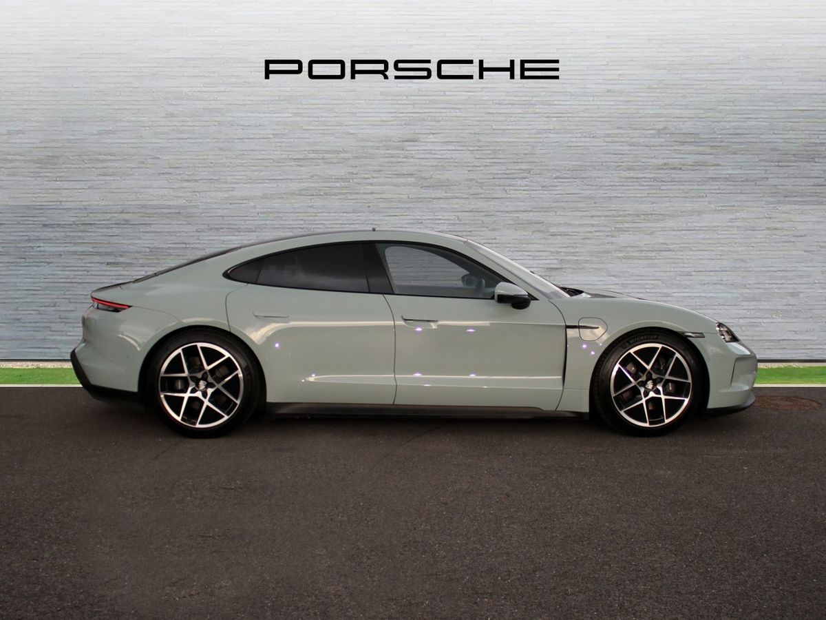 2025 Porsche Taycan. Finished in Shade Green Metallic. Paired perfectly with a Black leather interior.