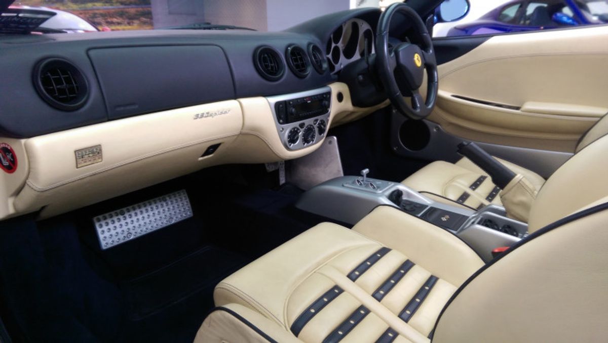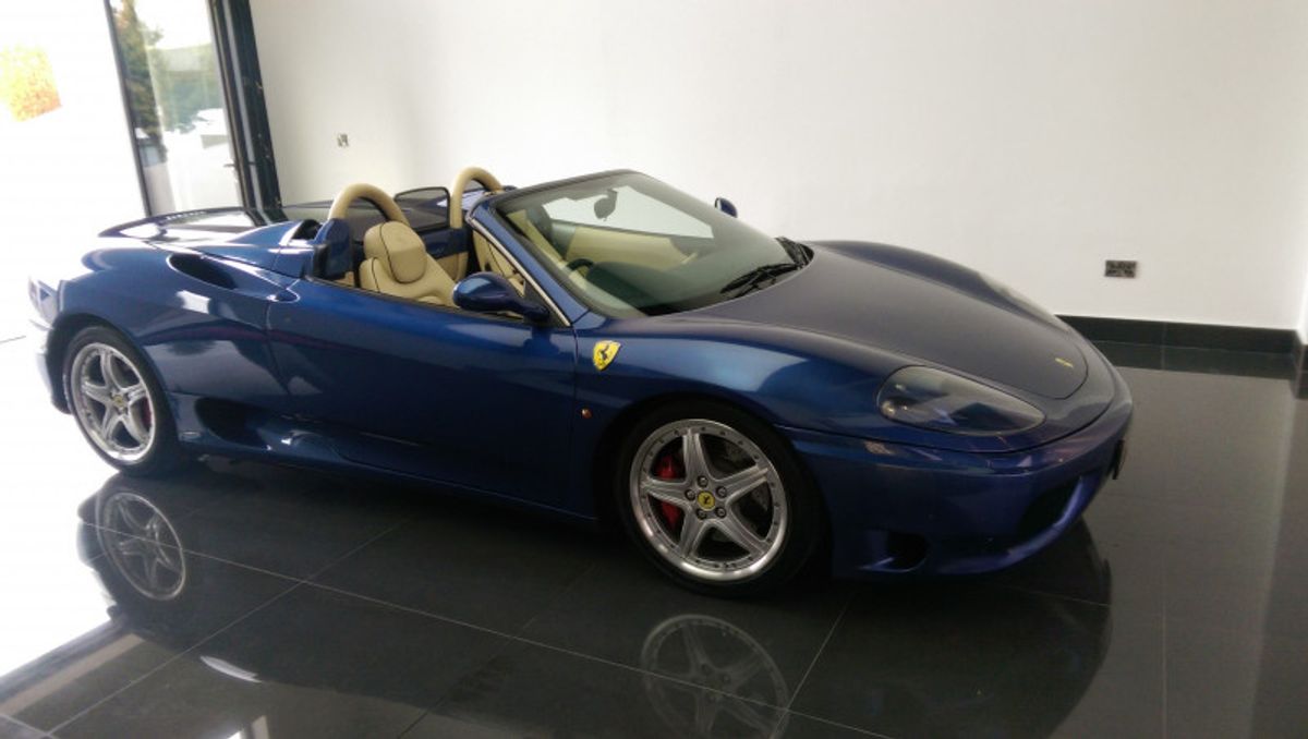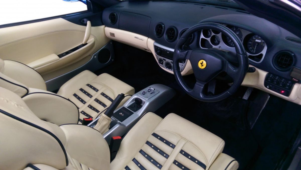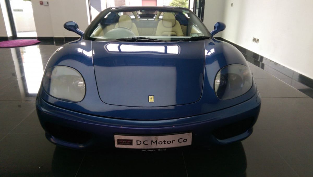 Beautiful 360 Spider, 19 Inch Modular Split Rims, Cream Daytona Style Seats with blue piping trim, Blue carpets, Electrically Operated Seats, Scuderia Ferrari Shields on Front Wings, Hi-fi Sound System (With Subwoofer), 6 CD Changer, Rear Challenge Style Black Grille, Contrasting Blue Hood, Comprehensive service history, and belts all done recently, Excellent bodywork, Interior - Excellent Condition, Tyre condition Excellent, Standard Features - Electric door mirrors, Alarm, Electric windows, Remote central locking, Immobiliser, Airbags, Sports seats..please call for more details.
