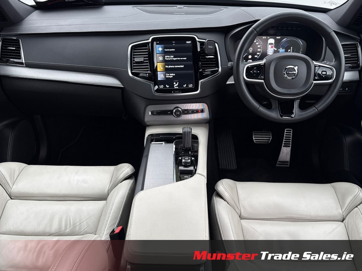 221 Volvo XC90 R-Design Pro Finished in Black metallic Contrasting an ivory Exclusive leather. Specification includes. 22" Alloys. Panoramic Glass Sunroof. 360" Reverse Camera. Harmon Kardon Audio. Xenon Headlights. Automatic Transmission Adaptive cruise control. Sun protection Glass. Full leather interior. Electric boot door. Side steps. Heated Seats front & Rear. Heated steering wheel. Bluetooth Phone preparation. Multifunctional Steering Wheel. Electric tow bar. Price includes. Full Vehicle Service & Inspection, Professionally valeted & Detailed, Finance Available To Apply visit www.munstertradesales.ie Air conditioning, Climate control, Dual zone climate control, Multi zone climate control, Armrest, Keyless entry, Electrically adjustable seats, Electric boot, Electric side mirrors, Electric windows, Electric handbrake, Heated seats, Lumbar support, Multi-function steering wheel, Rain sensor, Split rear seats, Gear shift paddles, Bluetooth, MP3 compatible, 12v power outlet, Radio, Touch screen display, USB connection (front), Wifi, Adaptive cruise control, Cruise control, Hill hold assist, Navigation system, Parking camera, Front parking sensors, Rear parking sensors, Remote boot release, Roof rails, Speed limiter, Start-stop system, Traffic sign recognition, Voice control, Parking assistance, Digital instrument panel, Alloy wheels, Leather steering wheel, Spoiler, Sports seats, Ambient lighting, Auto lights (dusk sensor), Daytime running lights, LED headlights, ABS, Lane change assist, Anti collision system, Alarm system, Emergency brake assist, Central locking, Driver-side airbag, Immobilizer, Isofix, Lane departure warning, Tyre pressure monitor, Passenger-side airbag, Seat belt warning, Side airbag, Stability control, Traction control, Emergency tyre repair kit, 4WD